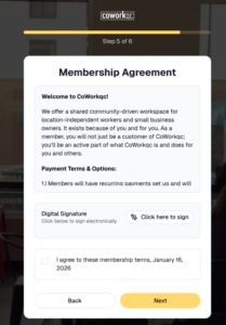 - Read over the Membership Agreement and digitally sign it, select that you agree with the agreement terms, THEN click “Next”